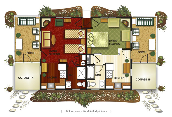 The ambience of each cottage is one of relaxed comfort. Fashionable cottage decor is enhanced with coordinating spreads & dust ruffles, moldings, 2” wood blinds, new sleep sofas, wing chairs and sleeper lounge chairs, as well as antiques, reproductions and other eclectic furnishings